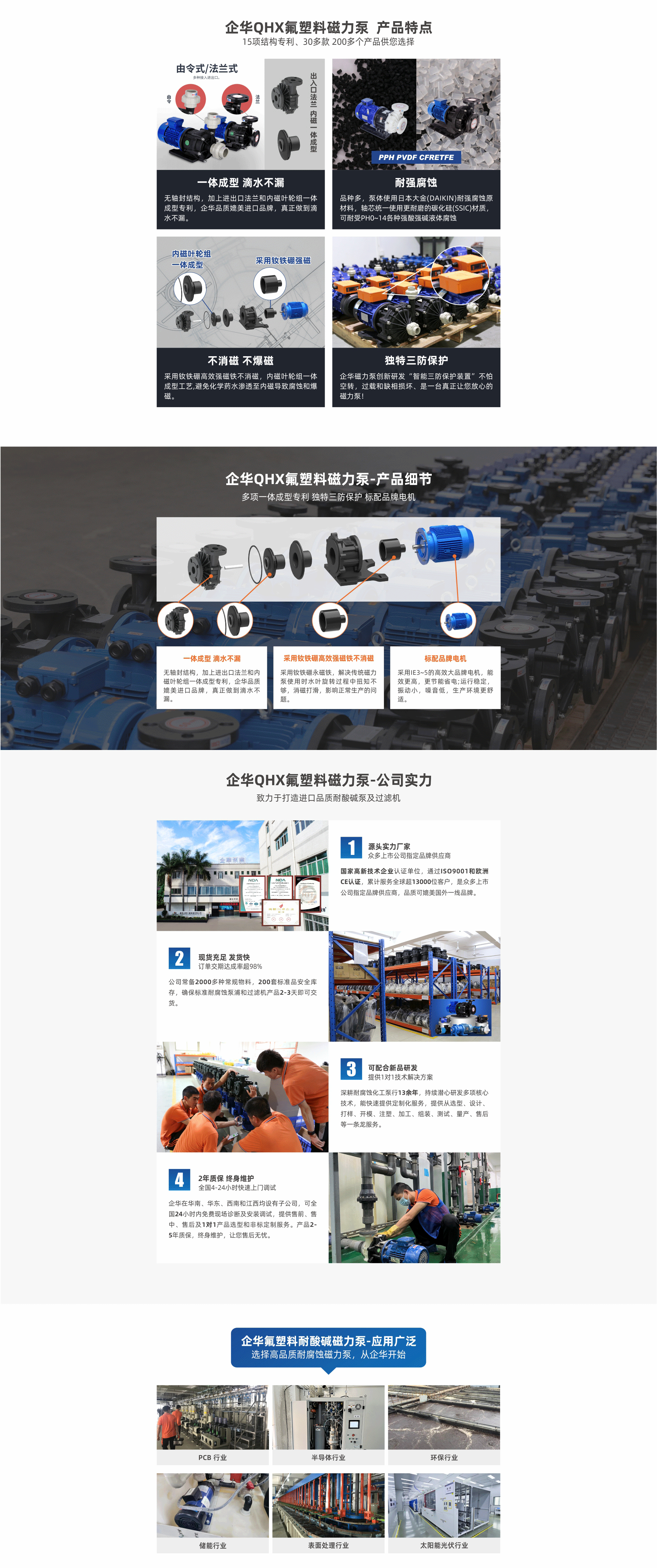 耐強腐蝕,進出口法蘭一體成型專利滴水不漏;采用欽鐵硼高效強磁不消磁,內磁葉輪體成型不爆磁;多種泵頭材質、流量大震動小、噪音低,可另配“智能三防保護裝置”,拒絕空轉損壞。